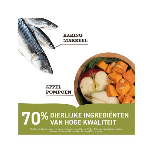 Frischer pazifischer Hering (14 %), frische pazifische Sardine (12 %), frischer Alaska-Heilbutt (8 %), getrockneter Hering (8 %), getrockneter pazifischer Kabeljau (7 %), getrockneter Weißfisch (7 %), grüne Erbsen, rote Linsen, Kichererbsen, grüne Linsen, Pollack-Öl (6 %), frischer Silber Seehecht (4 %), frische Rotstreifen-Seenadel (4 %), Kichererbsen, ganz Erbsen, sonnengereifte Luzerne, kaltgepresstes Sonnenblumenöl, Linsen-Fasern, getrockneter brauner Seetang, frischer Kürbis, frischer Butternut-Kürbis, Pastinaken, frischer Spinat, frischer Grünkohl, frisches Senfgrün, frisches Steckrübengrün, frische Karotten, frische rote Äpfel, frische Bartlett-Birnen, gefriergetrockneter Lebertran (0,1 %), frische Cranberries, frische Heidelbeeren, Chicorée-Wurzel, Gelbwurz, Mariendistel, Klettenwurzel, Lavendel, Eibischwurzel, Hagebutten.