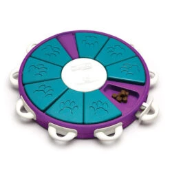 Der Dog Twister bietet viel Spielspaß für Ihren Hund. Das Hundespielzeug besteht aus einem Brett mit Scheiben in der Form von Kuchenstücken und an den Rändern befinden sich Griffe. Unter den Kuchenstücken können Sie Leckerlis verstecken, indem Sie an den Griffen ziehen. Verstecken Sie die Leckerlis und achten Sie dabei darauf, dass Ihr Hund dies sieht. Danach ist Ihr Hund an der Reihe und muss die Leckerlis suchen. Hierbei muss Ihr Hund versuchen die einzelnen Kuchenstücke wegzuschieben. Wenn Sie an den Griffen ziehen, können Sie die Kuchenstücke versetzen. Der Schwierigkeitsgrad des Het Dog Twisters beträgt Niveau 3. Für mehr Informationen über die Spielzeuge von Nina Ottosson können Sie hier klicken.